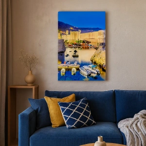 - Táto plátenná tlač zobrazuje malebný nočný prístav s osvetlenými budovami a loďami plávajúcimi na pokojnej vode. Ideálna do interiérov plných harmónie a romantiky.