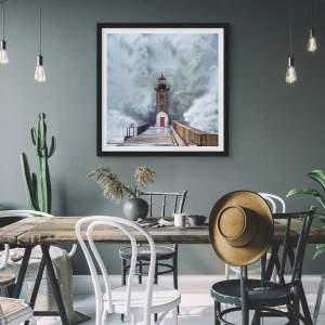 Plagát v čiernom ráme - Maják obklopený silnými vlnami počas búrky - 50x70cm - Hukot vody, šum vetra - Moderná nástenná dekorácia do obývacej izby a spálne ARTTOR
