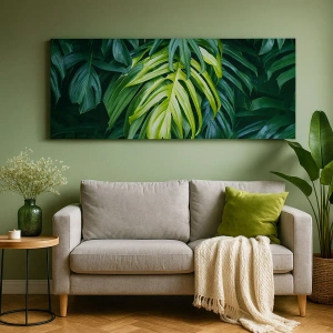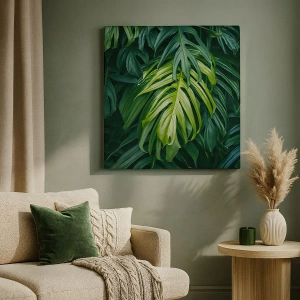 - Tropické zelené listy v hustom usporiadaní pútajú pozornosť svojou harmóniou a sviežosťou. Ideálna nástenná dekorácia pre milovníkov prírody.