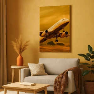 Plátno „Let smerom k slnku“ zobrazuje majestátny vzlet osobného lietadla na pozadí zlatej oblohy pri západe slnka. Teplé farby a dynamická kompozícia zdôrazňujú pohyb a emócie spojené s cestovaním a objavovaním sveta. Tento pohľad inšpiruje sny o dobrodružstve a objavovaní nových miest.