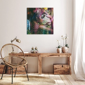 - Obraz zobrazuje jemný portrét ženy obklopenej exotickou zeleňou a tropickými odtieňmi. Umelecká kompozícia spája prírodu s eleganciou.