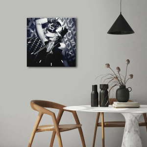 Motív ženy v maske symbolizuje tajomstvo a sofistikovaný štýl, zatiaľ čo čiernobiela farebná schéma dodáva nadčasovú eleganciu. Vzorované pozadie v kombinácii s ozdobnými detailmi šperkov a masky vytvára dekoráciu, ktorá priťahuje pozornosť a dodáva interiéru charakter.