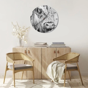 - Detailný záber na tvár škótskeho dobytka, čiernobielo vykreslený. Tieto okrúhle hodiny, vyrobené na skle, majú rozmery 30 x 30 cm. Sú ideálne do rustikálneho aj moderného interiéru s nádychom prírody.