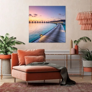 Plátno „Prázdniny - Návrat k prameňom“ je jedinečný dekoratívny prvok, ktorý vás prenesie do tropickej atmosféry plnej pokoja a luxusu. Zobrazuje malebné mólo vedúce k vodným domom, zaliate teplým svetlom zapadajúceho slnka.