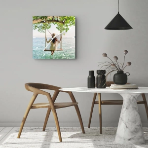 - Obraz ženy sediacej na hojdačke zavesenej nad morom, obklopenej zeleňou a modrou vodou. Bezstarostné letné prostredie v tropickom podnebí evokuje pocit pokoja a relaxácie.