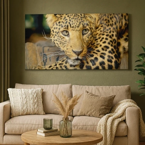 Nebojte sa, priblížte sa je unikátna tlač na plátno, ktorá zobrazuje majestátneho leoparda v jeho prirodzenom prostredí. Tento detailný portrét tohto krásneho predátora odhaľuje detaily jeho vzoru, výrazné oči a divokú prírodu. Teplé farby a kontrast medzi žltou srsťou a okolím dodávajú obrazu hĺbku a dynamiku.