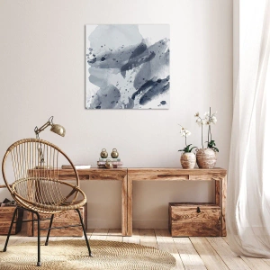 - Obraz zobrazuje abstraktné škvrny modrej na svetlom pozadí. Minimalistická kompozícia dodáva interiéru pocit pokoja a elegancie.