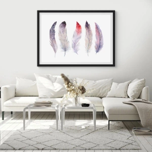 Kompozícia pierok v pastelových farbách s jemnými akcentmi ružovej, modrej a fialovej vytvára jedinečný vzor, ktorý priťahuje pozornosť svojou eleganciou. Minimalistický charakter plagátu z neho robí perfektný doplnok do moderného a štýlového interiérového dizajnu.