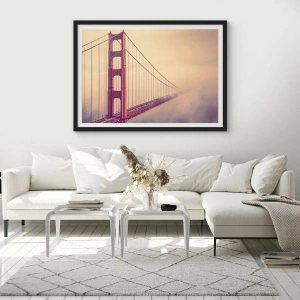 Plagát v čiernom ráme - Most Golden Gate vo vintage hmle - 50x70cm - Medzi nebom a zemou - Moderná nástenná dekorácia do obývacej izby a spálne ARTTOR