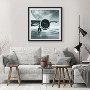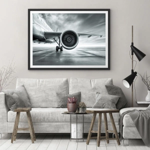 Plagát v čiernom ráme - Prúdový motor lietadla v monochromatických tónoch - 50x70cm - Toto je sila! - Moderná nástenná dekorácia do obývacej izby a spálne ARTTOR