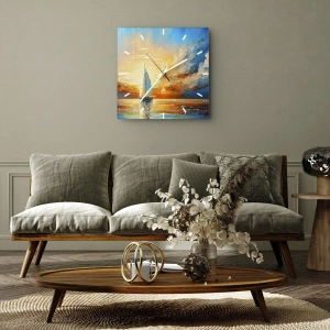 Hodiny do obývačky s grafikou „Sailing in Gold“ sú jedinečnou kombináciou západu slnka, námorníckej estetiky a maliarskeho remeselného spracovania. Perfektná voľba pre každého, kto sa chce obklopiť krásou a pokojom vo svojom každodennom živote.