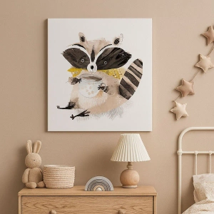 - Obraz zobrazuje očarujúceho mývala, ktorý drží v rukách pohár, obklopeného pastelovými farbami. Ideálny na zdobenie detskej izby, dodáva humor a útulnosť.