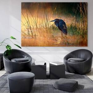 - Tento obraz zobrazuje volavku stojacu pri jazere počas západu slnka. Ideálny do kancelárie alebo obývačky.