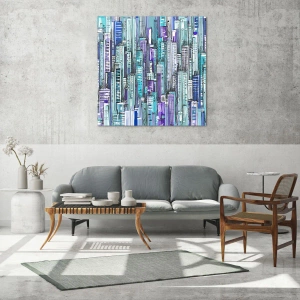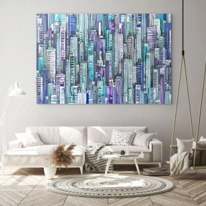 Nástenný obraz - Modré z neba - Ilustrácia mesta plného mrakodrapov v chladných odtieňoch