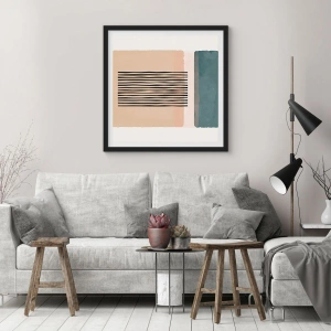 Plagát zobrazuje jednoduché geometrické tvary, ktoré boli skombinované do umeleckej kompozície. Jemné farby ako béžová, ružová a zelená vytvárajú príjemný kontrast s čiernymi čiarami, čím dodávajú celému dielu moderný a sofistikovaný charakter. Tento motív sa perfektne hodí do škandinávskych, minimalistických a súčasných dizajnových štýlov.