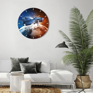 Nástenné hodiny s futuristickým dizajnom zobrazujúce mimoriadny pohľad na vesmírnu loď vznášajúcu sa nad Zemou na pozadí plnom hviezd. Tento jedinečný motív prináša do interiéru moderný štýl a inšpiruje k objavovaniu neznámych svetov.