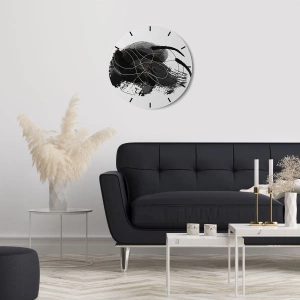- Tieto okrúhle nástenné hodiny s rozmermi 30x30 cm sa vyznačujú abstraktným vzorom čiernych ťahov štetcom a zlatých čiar na svetlom pozadí. Ich elegantný a moderný dizajn sa perfektne hodí do štýlových interiérov.