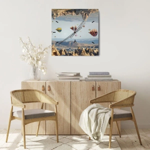 Nástenné hodiny - Balóny na pozadí horskej krajiny - 30x30cm - Tu je možné všetko - Moderná nástenná dekorácia do obývacej izby, kuchyne a spálne ARTTOR