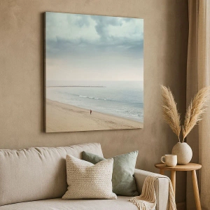 - Obraz zobrazujúci osamelú postavu na prázdnej pláži s pokojným morom. Táto minimalistická a upokojujúca krajina prináša do interiérov harmóniu a eleganciu, vďaka čomu je perfektným doplnkom priestorov s jemným charakterom.