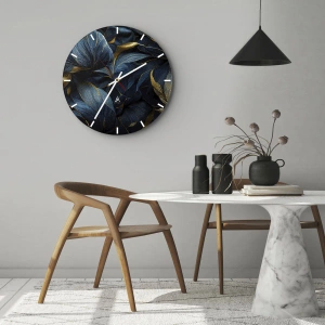 • Hodiny sa vyznačujú elegantnou kompozíciou tmavých kvetov zdobených zlatými líniami. Vyvážená kombinácia sýtych tónov a nádychu zlata vytvára rafinovaný dekoratívny akcent s jemnou, luxusnou estetikou.