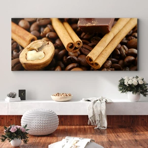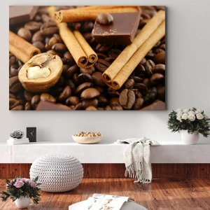 Obraz na plátne - Kávové zrná so škoricovými tyčinkami, čokoládou a vlašskými orechmi. - 70x50cm - Koncert vôní - Moderná nástenná dekorácia do obývacej izby a spálne ARTTOR