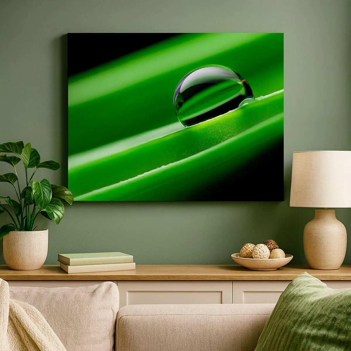 - Jemná kvapka rosy spočíva na intenzívne zelenom liste. Táto kompozícia zdôrazňuje krásu detailov v prírode. Dokonalá dekorácia pre minimalistické a ekologické interiéry.