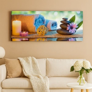 - Tento obraz zobrazuje relaxačnú kúpeľnú súpravu s uterákmi, sviečkami a kameňmi na prírodnom pozadí. Ideálny do wellness priestoru. Rozmery: 70x50cm.