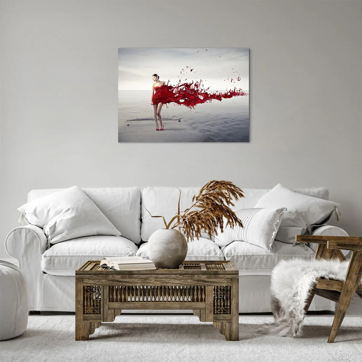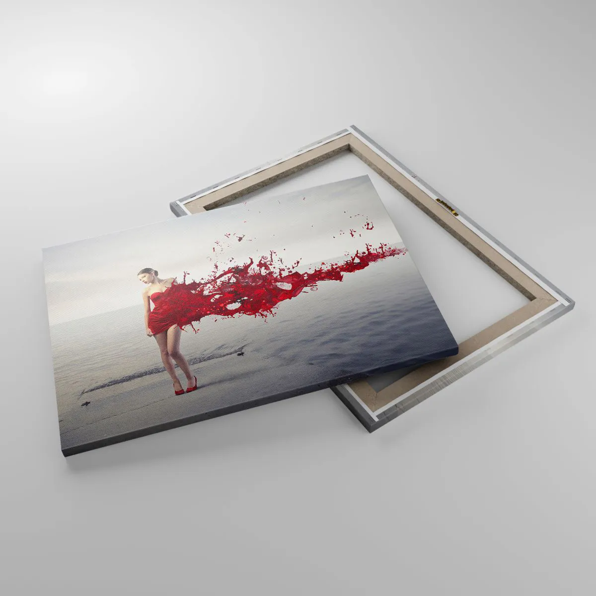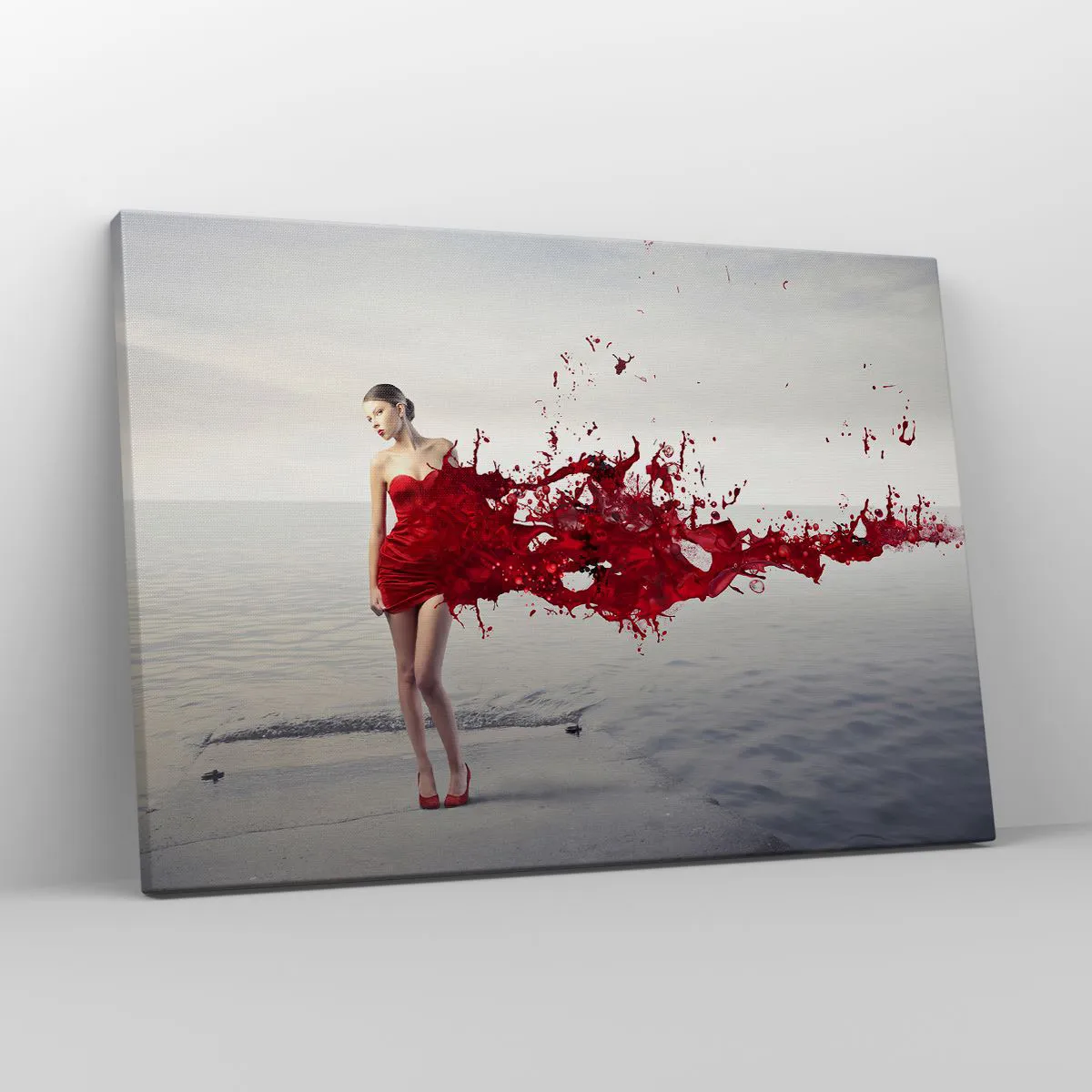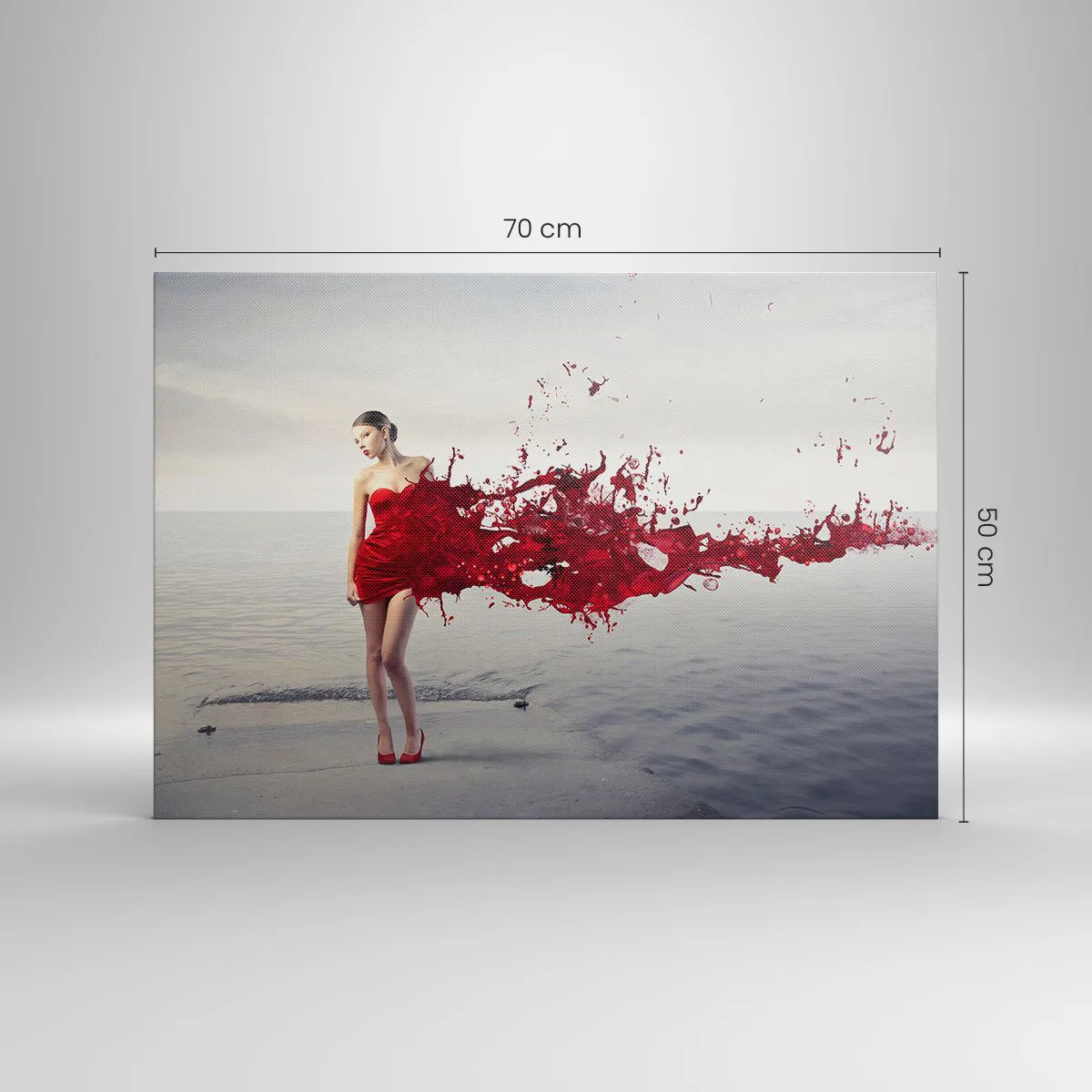 Tento obraz je vynikajúcou voľbou pre milovníkov súčasného umenia a moderného dizajnu. Kontrast medzi intenzívnou červenou farbou šiat a pokojným pozadím vody dodáva dielu hĺbku a harmóniu, vďaka čomu je ideálnym doplnkom do obývačky, spálne alebo komerčného priestoru.