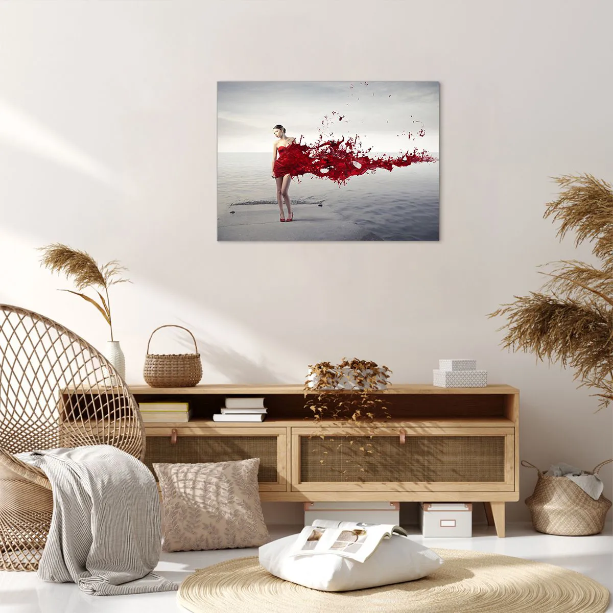 - Obraz zobrazuje ženu v umeleckej kompozícii v červených šatách na pozadí pokojnej vody. Ideálny do interiérov prekypujúcich eleganciou a štýlom.