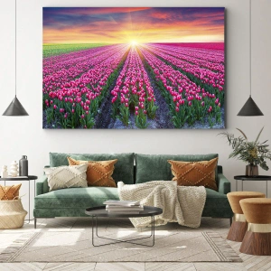 - Očarujúci obraz zobrazujúci pole tulipánov zaliate svetlom zapadajúceho slnka. Dokonalá zmes ružových kvetov, zelených listov a teplých odtieňov oblohy vytvára harmonickú krajinu, ktorá oživí každý interiér.