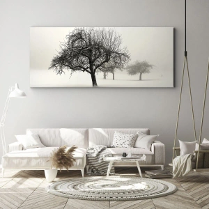 - Jemná krajinka zobrazujúca stromy na zasneženom poli obklopenom hmlou. Tento minimalistický obraz prináša pokoj a harmóniu do každého interiéru.