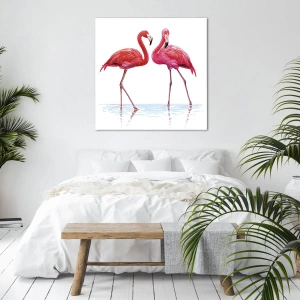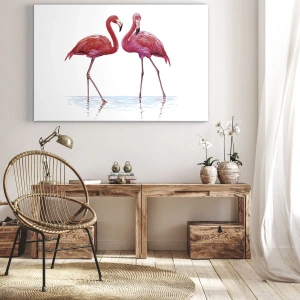 - Tento obraz zobrazuje pár plameniakov stojacich vo vode na svetlom pozadí. Je to perfektná voľba pre milovníkov exotických motívov a elegantného interiérového dizajnu.