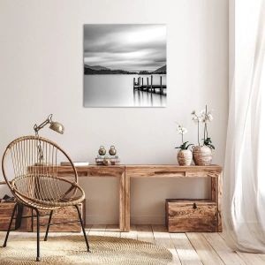 Monochromatické farby zdôrazňujú nadčasový charakter obrazu a dodávajú mu minimalistický a tlmený vzhľad. Scéna zobrazujúca pokojnú hladinu jazera a mólo, ktoré akoby smerovalo k horizontu, prináša do interiéru harmóniu a pocit pokoja.