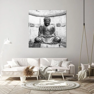 „Pri zdroji pokoja“ je elegantný a jemný obraz na plátne, ktorý vytvára atmosféru pokoja a spirituality. Zobrazuje sochu Budhu v meditačnej póze, vyhotovenú v monochromatickom štýle, čím zdôrazňuje nadčasovú povahu diela.