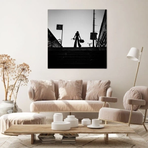 - Tento čiernobiely obraz zobrazuje ženskú siluetu na schodisku, čím vytvára dynamickú mestskú scenériu. Je to perfektná dekorácia pre moderné interiéry plné štýlu a minimalizmu.