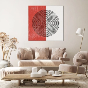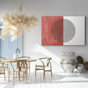 Pozadie obrazu je rozdelené na dve časti: intenzívnu červenú vľavo a bielu vpravo. Vďaka tomuto rozdeleniu získavajú čierne čiary kruhu jasnosť a celá kompozícia nadobúda moderný a estetický charakter. Geometrický vzor dokonale zapadá do minimalizmu a súčasných trendov.