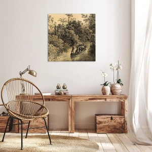 - Tento obraz vo vintage štýle zobrazuje džungľu s loďkou na rieke. Detailné umelecké dielo a sépiové tóny vytvárajú jedinečnú atmosféru, ktorá dodá eleganciu každému interiéru.
