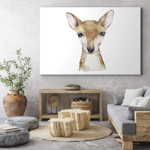 - Tento obraz zobrazuje jemný akvarelový portrét mladého jeleňa na bielom pozadí. Je ideálny na vytvorenie harmonickej atmosféry v moderných a minimalistických interiéroch.