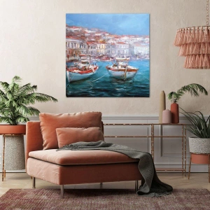 - Obraz na plátne „Taliansky záliv“ zobrazuje očarujúci pohľad na loď na pozadí malebnej talianskej architektúry a azúrového mora. Je to perfektný doplnok do interiérov navrhnutých tak, aby evokovali harmóniu a dovolenkovú atmosféru.