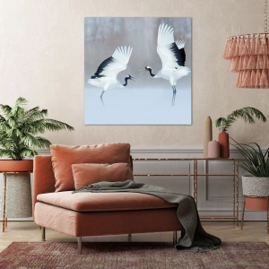 - Tento obraz zobrazuje dva žeriavy v elegantnom tanci na pozadí jemnej hmly. Tento motív vyžaruje harmóniu a pokoj, ideálny pre moderné interiéry.