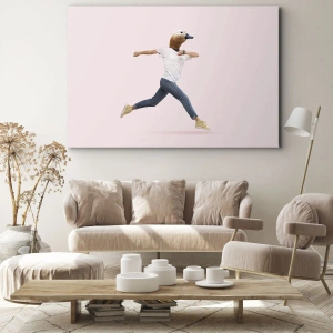 • Surrealistický obraz zobrazujúci postavu s kačacou hlavou v dynamickom pohybe. Minimalistické pastelové pozadie zdôrazňuje kreatívny a jedinečný charakter dekorácie.