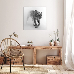 - Obraz zobrazuje majestátneho tigra vychádzajúceho z hmly v jemných čiernobielych tónoch. Je to perfektný doplnok do interiérov, ktoré oslavujú divokosť a eleganciu prírody.