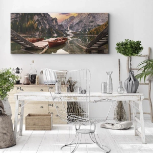 Nástenné umenie - Sľub dňa - Horské jazero s loďkami pri západe slnka
