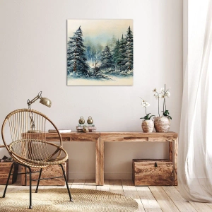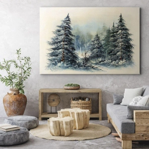 - Tento obraz zobrazuje zimnú krajinu so zasneženými stromami, ktorá vyžaruje pokoj a harmóniu. Je to perfektný doplnok do každého interiéru počas sviatkov a zimy.