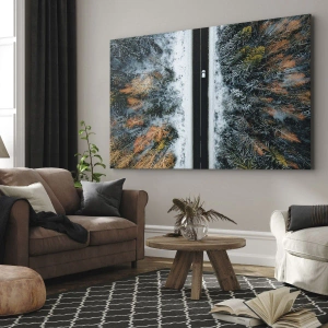 - Táto plátenná tlač s rozmermi 70x50 cm zobrazuje zimnú krajinu s lesným chodníkom z vtáčej perspektívy. Je to perfektná dekorácia pre milovníkov prírody a tých, ktorí cenia jedinečné výhľady.