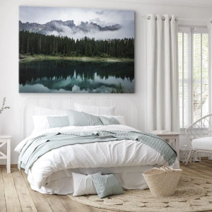 - Táto plátenná tlač s rozmermi 70x50 cm zobrazuje horskú krajinu s lesom a jazerom, v ktorom sa odráža obloha. Je to perfektná dekorácia pre milovníkov prírody a pokojných scenérií.