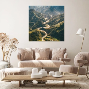 - Táto plátenná tlač zobrazuje malebnú horskú krajinu s kľukatou cestou medzi zelenými kopcami. Ideálna do interiérov navrhnutých tak, aby evokovali harmóniu a pokoj prírody.