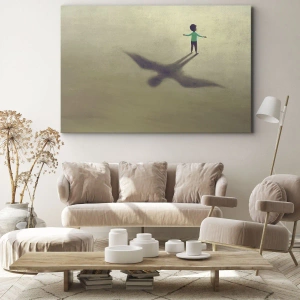 - Tento obraz zobrazuje dieťa s tieňom vtáka na pozadí v teplých tónoch. Ideálny do interiérov inšpirovaných symbolikou a pokojom. Tlač na plátne má rozmer 70x50 cm.