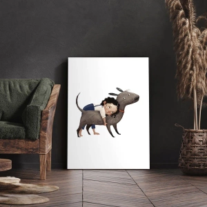- Táto pôvabná tlač na plátno s rozmermi 70x50 cm zobrazuje dieťa, ktoré sa túli so psom v kreslenom štýle. Perfektná voľba do detských izieb, prináša radosť a teplo.