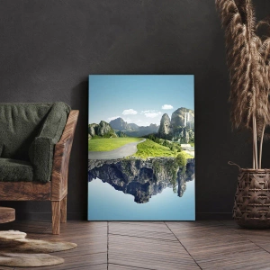 - Obraz na plátne zobrazujúci plávajúci ostrov s horami, vodopádmi a cestou na pozadí modrej oblohy. Ideálny do interiérov plných snov a harmónie.